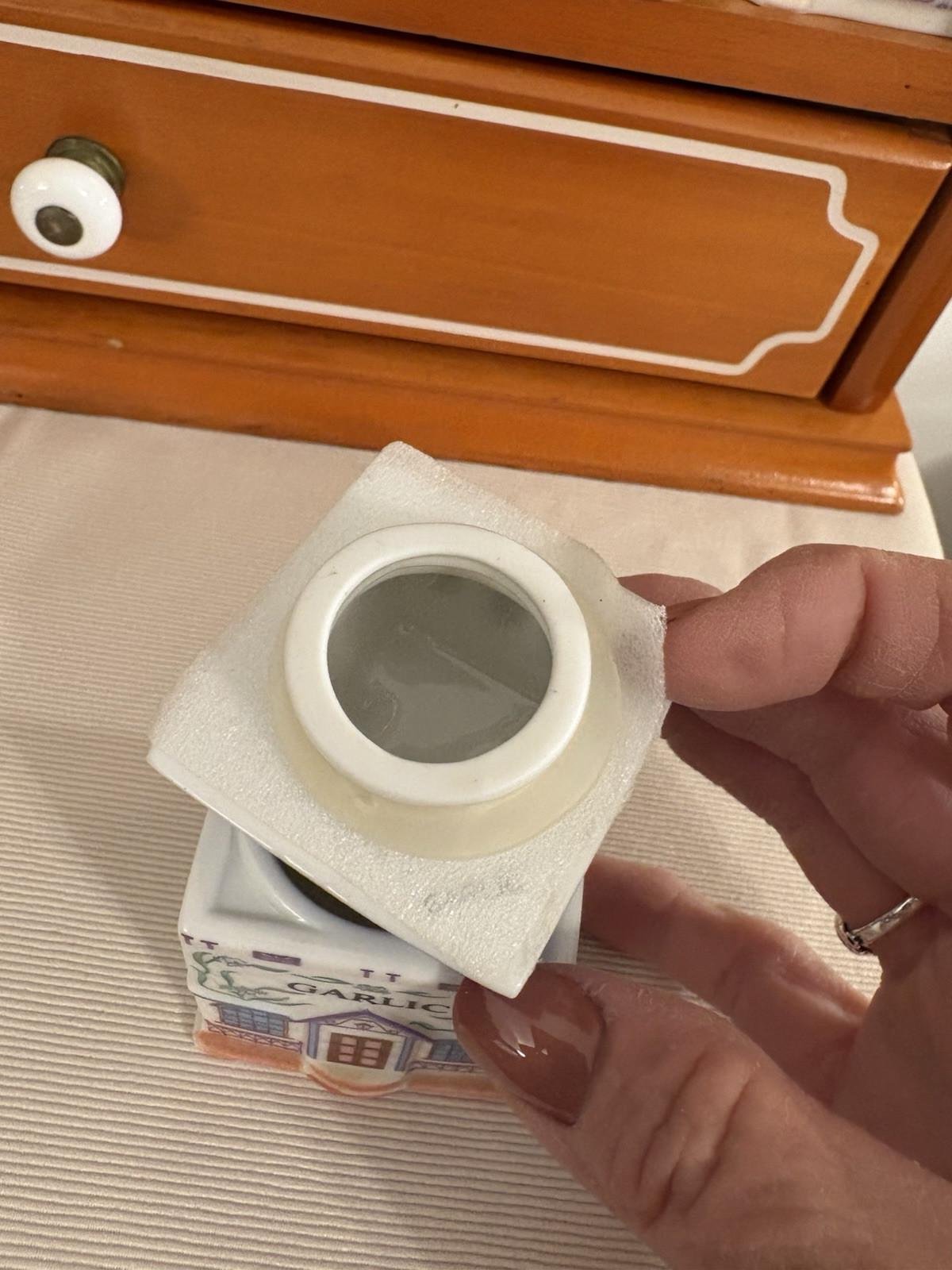 The jars are in perfect condition. Only 3 are missing the small styrofoam on the lid. All have the original made in Taiwan sticker on the bottom. The shelf has a little wear and tear as seen in the pictures but overall an amazing piece for its age.